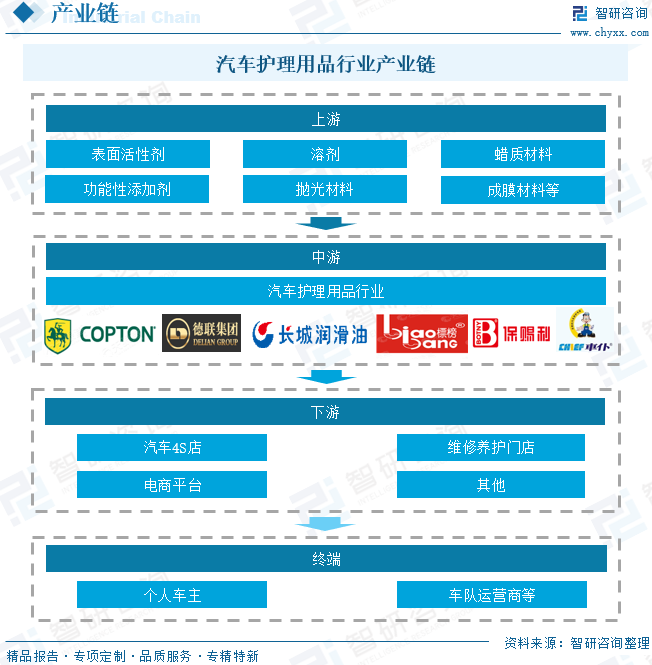 汽车护理用品产业链上游为原材料,主要包括表面活性剂、溶剂、蜡质材料、功能性添加剂、抛光材料、成膜材料等。产业链中游为汽车护理用品的生产制造环节,这一环节的企业负责将上游提供的原材料加工成各种汽车护理用品。产业链下游通过汽车4S店、维修养护门店、电商平台等渠道,最终服务于个人车主、车队运营商等终端消费者,完成从产品生产到市场应用的价值传递。