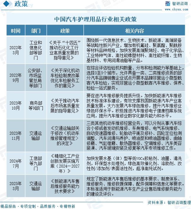 近年来,随着人们生活水平的快速提高,汽车已经成为一种不可缺少的“代步工具”,汽车保有量不断增加,极大地推动汽车后市场的发展。汽车护理用品作为汽车后市场的重要组成部分,近几年国家层面和地方政府相继出台了一系列政策,核心目标是规范市场秩序、保障产品质量与消费者权益,并推动行业向绿色、环保、高效的方向转型。例如,2024年7月,工信部等九部门印发《精细化工产业创新发展实施方案(2024—2027年)》,加快发展水基(体)型等低VOCs胶粘剂、油墨、清洗剂,环保型水处理剂,绿色高效催化剂、溶助剂、改性剂/添加剂/表面活性剂,超净高纯试剂。2025年3月,交通运输部印发《新能源汽车售后维修服务能力技术要求》,规定了新能源汽车售后维修的基本要求、制度体系、维修服务、维修救援保障、配件保障和信息化等要求。本标准适用于新能源汽车生产企业售后维修服务能力的建设及评价。