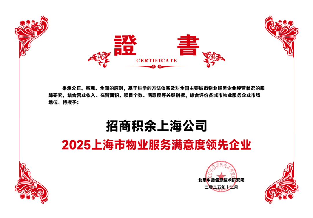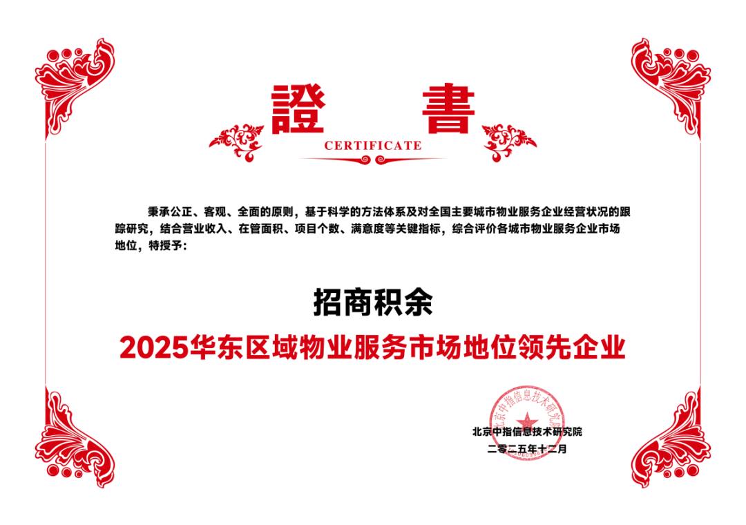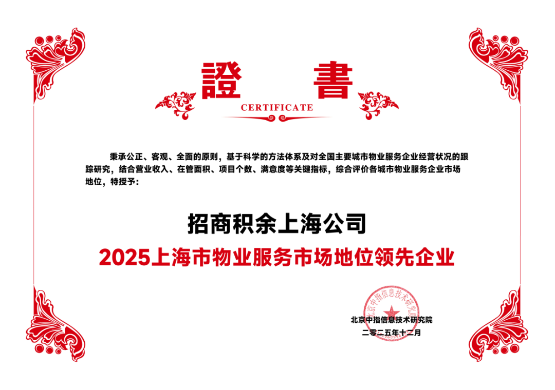 2025年12月11日,由北京中指信息技术研究院主办,中国房地产指数系统、中国物业服务指数系统承办的“2025中国房地产大数据年会暨2026中国房地产市场趋势报告会”在北京召开。招商积余凭借扎实的服务功底、领先的企业运营实力和卓越的品牌影响力,荣获“2025华东区域物业服务市场地位领先企业”。招商积余上海公司荣获“2025上海市物业服务市场地位领先企业”和“2025上海市物业服务满意度领先企业”,其在管的森兰美伦项目获评“2025年上海市品质物管好楼宇”奖项,同时招商积余杭州公司荣获“2025浙江省物业服务市场地位领先企业”殊荣。