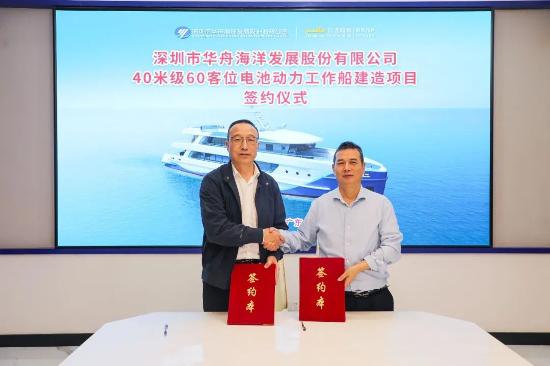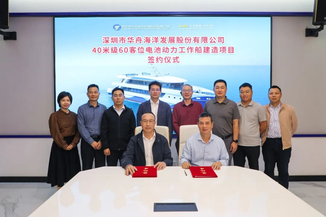 12月12日,江龙船艇(股票代码:300589)成功签约深圳市华舟海洋发展股份有限公司40米级60客位电池动力工作船。这一合作不仅彰显了江龙船艇在新能源船舶领域的技术硬实力,更标志着国内沿海交通船绿色智能化升级迈出关键一步。深圳港集团有限公司董事会秘书刘剑、深圳市华舟海洋发展股份有限公司董事长韩劲柏、江龙船艇董事长晏志清、董事兼副总经理贺文军等出席签约仪式。