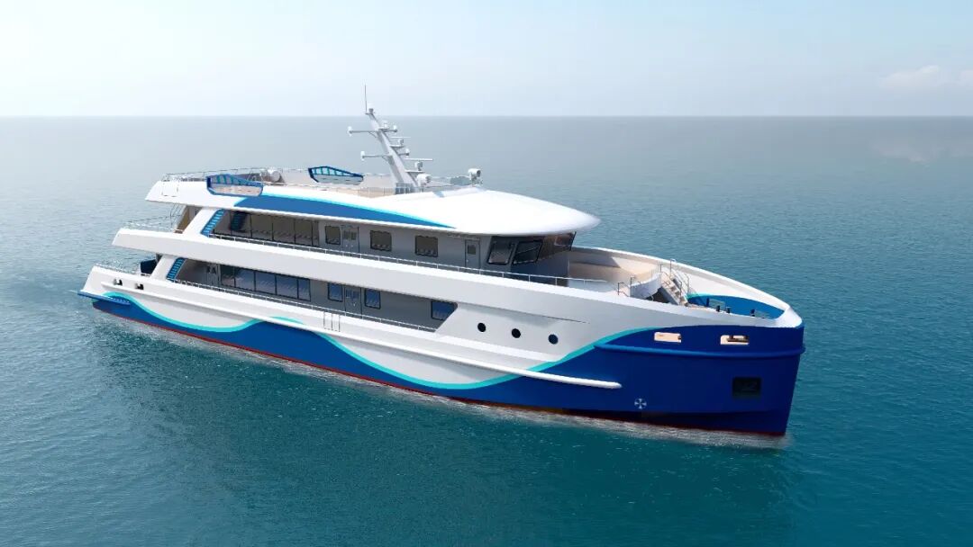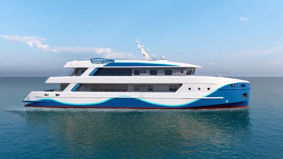 船舶外观设计独具匠心,以“驭浪 智航” 为核心主题,将海洋探索精神与科技感深度融合。动态战斧式直立船首减少航行阻力的同时,塑造出破浪前行的视觉张力。船体以 “科技白” 为主色调,搭配贯穿船首至船尾的上扬式 “华舟蓝” 动态色带,在碧海蓝天间形成鲜明辨识度,通过错落布局强化视觉层次感,凸显力量美学。