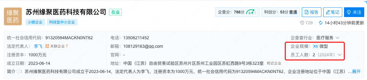 对于此次购买YJ2301项目,九典制药未对技术特点、转让方等情况作详细介绍。不过据公告显示,转让方苏州缘聚成立于2023年6月,至今两年多,是一家初创公司。另据企查查显示,苏州缘聚员工人数为2人,属于微型企业。