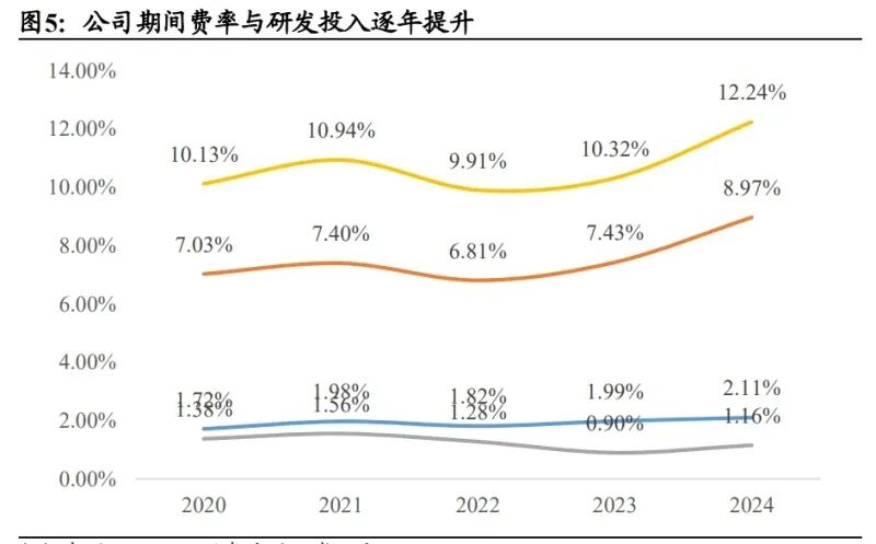航天军用产品是主要收入来源,期间费率与研发投入逐年提升。公司 2024 全年实现营业收入 142.80 亿元,其中航天产品收入 118.20 亿元,比上年同 期减少 17.63%,民用产品收入 23.73 亿元,比上年同期减少 43.89%。公司 营业收入毛利率为 20.99%,比上年同期改善 0.67 个百分点。销售费用比上 年同期减少 19.32%,管理费用比上年同期减少 7.95%,财务费用比上年同 期减少 2.07%,研发费用比上年同期减少 18.00%,税金及附加比上年同期 减少 0.71%。利润总额比上年同期增加 8.86%,净利润比上年同期增加 1.86%。 收入利润主要受航天电工 51%股权转让后出表影响。