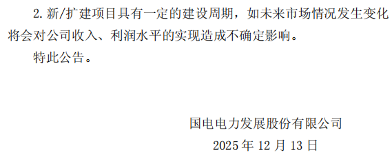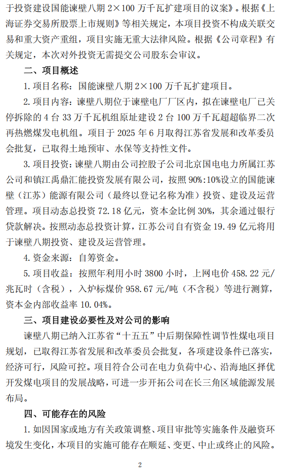 12月12日,国电电力发布公告称,公司控股子公司北京国电电力所属国家能源集团江苏电力有限公司和镇江禹鼎汇能投资发展有限公司,按照90%:10%设立的国能谏壁(江苏)能源有限公司投资、建设及运营管理的谏壁八期项目,总投资72.18亿元,资本金比例30%,其余通过银行贷款解决。