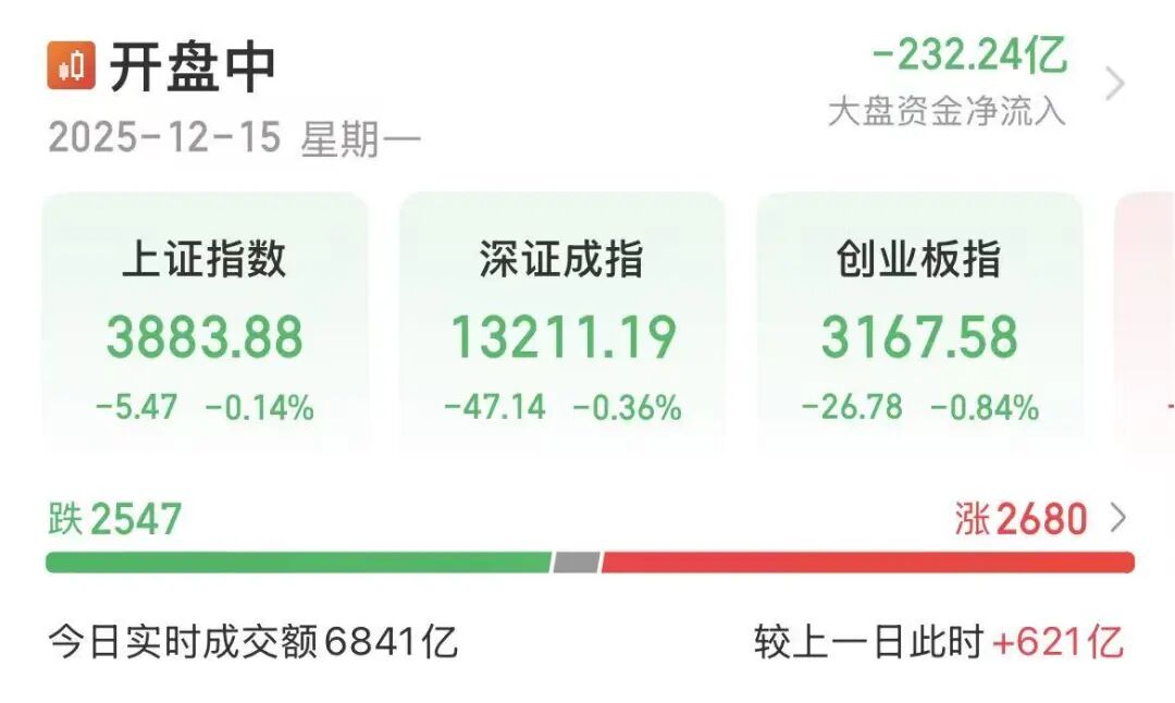 截至发稿,三大指数跌幅收窄,沪指跌0.14%,深证成指跌0.36%,创业板指跌0.84%。全市场成交额超6800亿元,较上一个交易日此时放量621亿元。