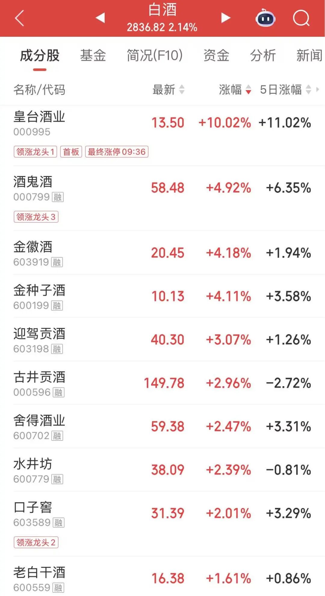 白酒板块集体反弹,皇台酒业涨停,酒鬼酒、金徽酒、金种子酒等涨幅居前。