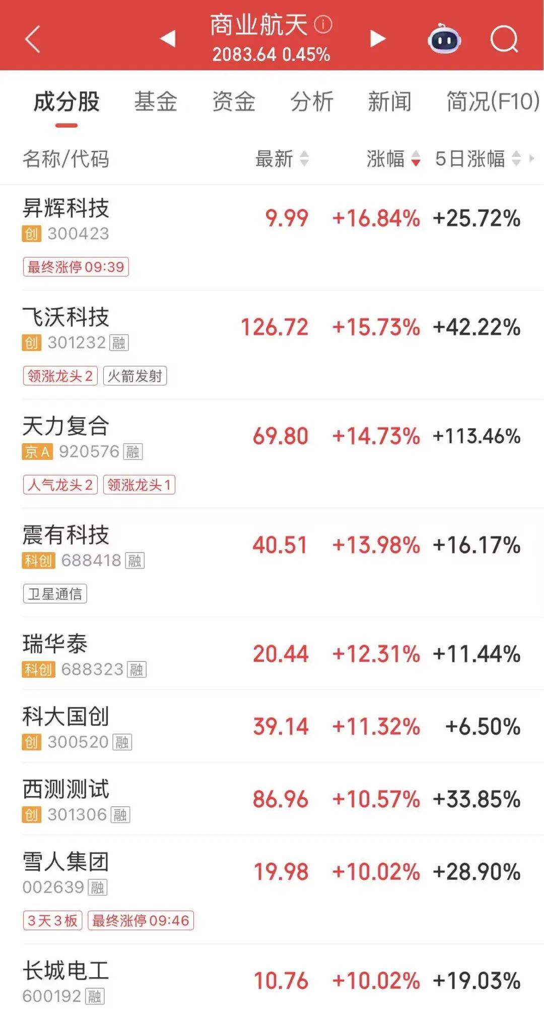 商业航天板块延续涨势,截至发稿,雪人集团、长城电工、中超控股、华菱线缆等多股涨停,昇辉科技开盘后迅速拉升实现“20cm”涨停,随后打开涨停板,截至发稿涨近17%。飞沃科技、震有科技、天力复合等涨幅居前。