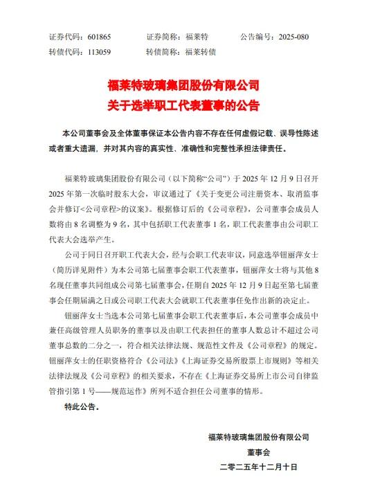 12月9日,福莱特(601865)公告称,公司于同日召开职工代表大会,经与会职工代表审议,同意选举钮丽萍女士为本公司第七届董事会职工代表董事,钮丽萍女士将与其他8名现任董事共同组成公司第七届董事会,任期自2025年12月9日起至第七届董事会任期届满之日或公司职工代表大会就职工代表董事任免作出新的决定止。