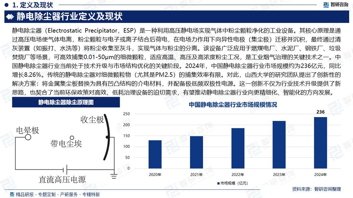 市场规模:中国静电除尘器行业当前处于技术升级与市场结构优化的关键阶段。2024年,中国静电除尘器行业市场规模约为236亿元,同比增长8.26%。传统的静电除尘器对细微颗粒物(尤其是PM2.5)的捕集效率有限。对此,山西大学的研究团队提出了创新性的解决方案:将金属集尘板替换为具有凹凸结构的介电材料,并配备极低频双极性电源。这种设计利用介电弛豫效应,能显著增强电场并提高细微颗粒的荷电量,从而实现对细颗粒物的精准捕集,突破了传统电除尘器在细颗粒治理方面的技术限制。这一创新不仅为行业技术升级提供了新思路,也契合了当前环保政策对高效、低耗治理设备的迫切需求,有望推动静电除尘器行业向更精细化、智能化的方向发展,进一步巩固中国在全球环保装备领域的技术领先地位。