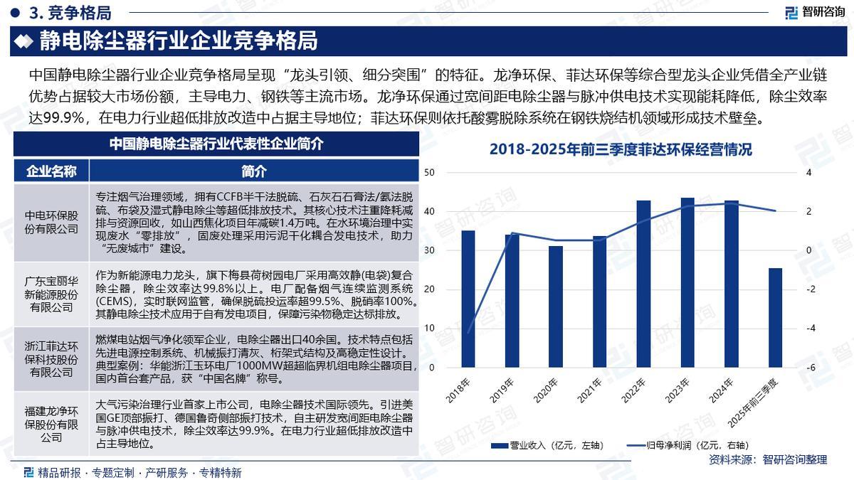 竞争情况:中国静电除尘器行业企业竞争格局呈现“龙头引领、细分突围”的特征。龙净环保、菲达环保等综合型龙头企业凭借全产业链优势占据较大市场份额,主导电力、钢铁等主流市场。龙净环保通过宽间距电除尘器与脉冲供电技术实现能耗降低,除尘效率达99.9%,在电力行业超低排放改造中占据主导地位;菲达环保则依托酸雾脱除系统在钢铁烧结机领域形成技术壁垒。