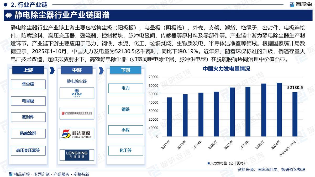 产业链核心节点:根据国家统计局数据显示,2025年1-10月,中国火力发电量为52130.5亿千瓦时,同比下降0.19%。近年来,随着环保标准的升级,倒逼存量火电厂技术改造,超低排放要求下,高效静电除尘器(如宽间距电除尘器、脉冲供电型)在脱硫脱硝协同治理中价值凸显。