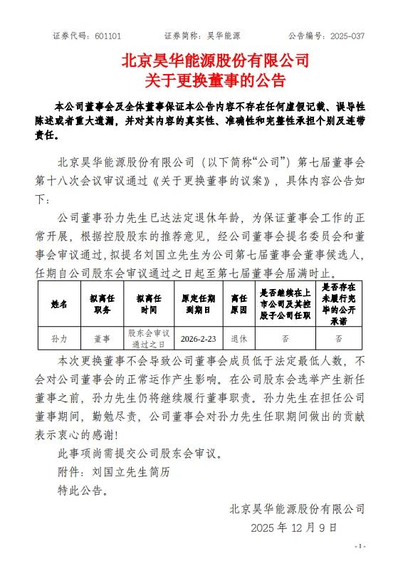 12月9日,昊华能源(601101)公告称,公司第七届董事会第十八次会议审议通过《关于更换董事的议案》。