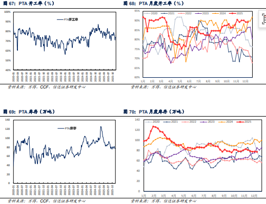 涤纶长丝:成本端,本周聚合成本小幅下跌。供给端,本周个别长丝装置短停检修,市场整体开工率小幅下滑。需求端,本周下游需求面整体表现偏弱,冬季订单已逐步进入收尾阶段,场内走货仍以冬季保暖面料为主,订单规模普遍较小,多以小体量补单形式呈现,新单尚未出现批量下达,产品价格小幅下跌,但由于聚合成本中枢下移,盈利略有修复。目前涤纶长丝周均价格POY 6400.00(-75.00)元/吨、FDY6645.83(-104.17)元/吨和DTY 7737.50(-112.50)元/吨,行业平均单吨盈利分别为POY43.00(+26.69)元/吨、FDY-92.51(+7.33)元/吨和DTY 267.00(+1.80)元/吨,涤纶长丝企业库存天数分别为POY16.70(+0.40)天、FDY22.20(+1.00)天和DTY 23.90(-0.40)天,开工率93.80%(-0.60pct)。