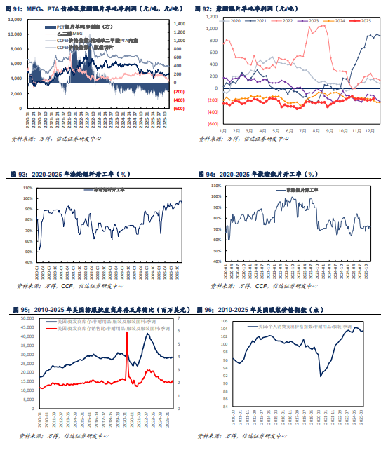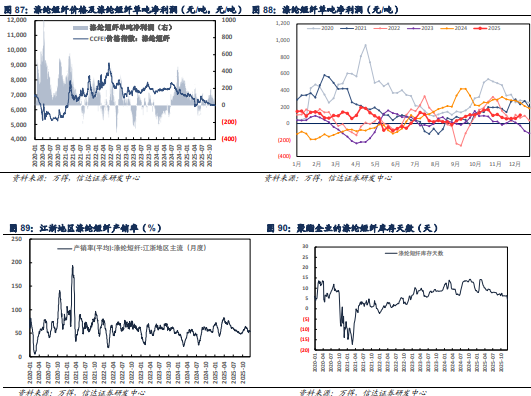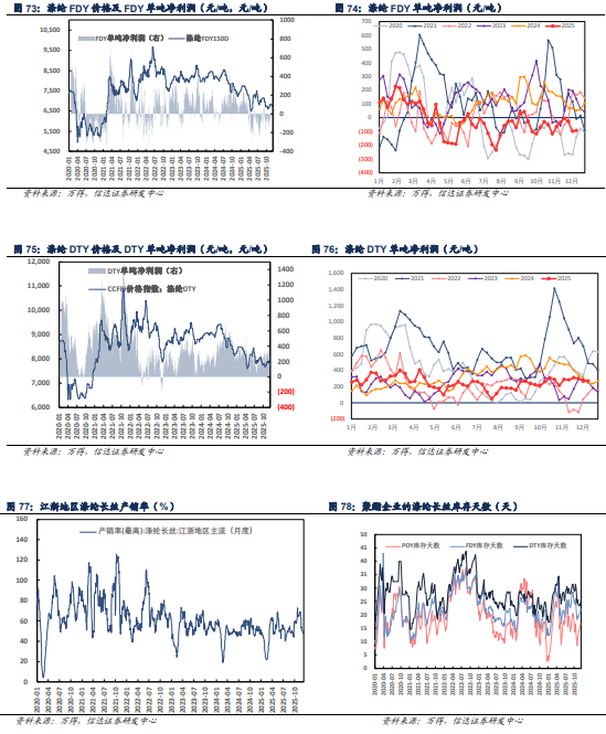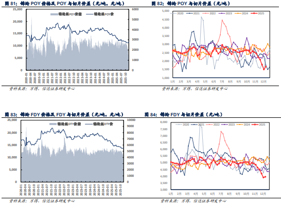 【聚酯&锦纶板块】本周聚酯、锦纶盈利有所修复。聚酯方面,涤纶长丝受原料价格中枢下移影响,叠加下游需求面整体表现偏弱,冬季订单已逐步进入收尾阶段,产品价格有所下跌,但跌幅较成本端偏窄,产品盈利小幅修复。短纤及瓶片价格小幅下跌。锦纶方面,本周PA6切片市场延续涨势,成本端支撑尚存,但下游企业跟进积极性不高,多维持刚需采买,产品价格价差小幅修复。