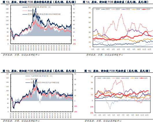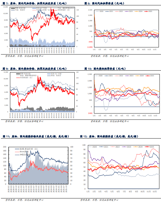 【炼油板块】周前期,中美经贸关系传积极信号,提振市场风险偏好,叠加乌克兰对俄罗斯袭击,俄罗斯供应担忧支撑,国际油价延续上周末涨势。周后期,伊拉克恢复在卢克石油的油田生产,加之EIA称美国今年石油产量预计创纪录高位,市场供应过剩担忧升温,同时乌美就安全保障协议深入磋商,俄乌可能达成和平的前景施压,国际油价有所下跌。2025年12月12日布伦特、WTI原油价格分别为61.12、57.44美元/桶,较2025年12月5日分别-2.63、-2.64美元/桶。成品油方面,国内成品油价格价差小幅震荡,东南亚地区柴油、航煤价格略有上涨,其它区域成品油价格普跌。