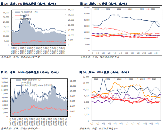 MMA:本周下游逢低刚需跟进为主,叠加成本端支撑偏弱,产品价格价差弱势下跌。本周MMA均价8987.50(-201.79)元/吨,MMA -原油价差5777.57(-152.83)元/吨。