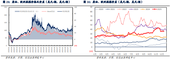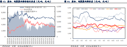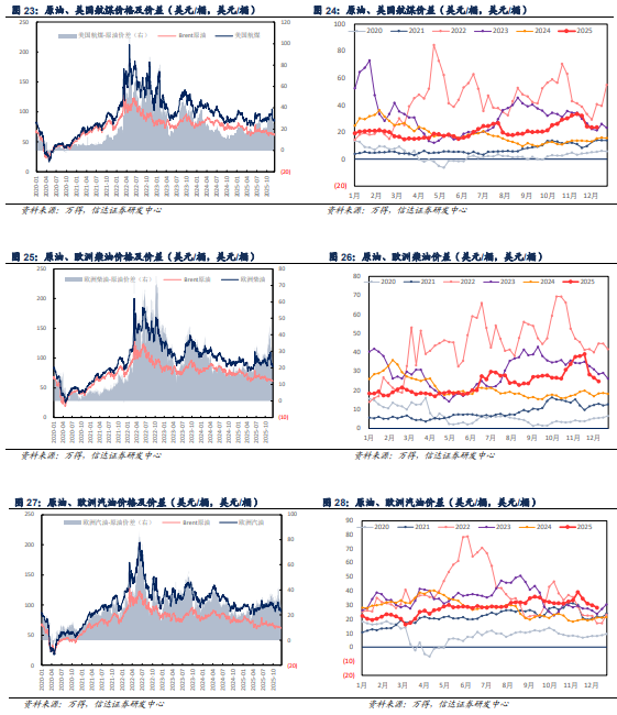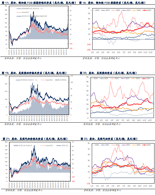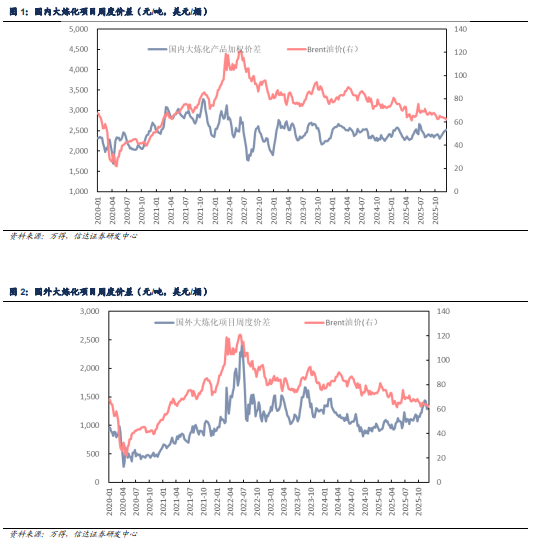 自2020年1月4日至2025年12月12日,布伦特周均原油价格涨幅为-8.13%,我们根据设计方案,以即期市场价格对国内和国外重点大炼化项目做价差跟踪,国内重点大炼化项目周均价差涨跌幅为+9.01%,国外重点大炼化项目周均价差涨跌幅为+41.39%。