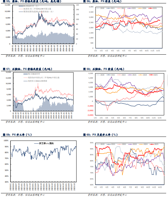 PX:成本端支撑弱势,产品价格小幅下跌。目前PXCFR中国主港周均价在5923.79(-68.08)元/吨,PX与原油价差在2707.65(-25.34)元/吨,PX与石脑油周均价差在2231.71(-14.35)元/吨,开工率89.21%(+0.00pct)。