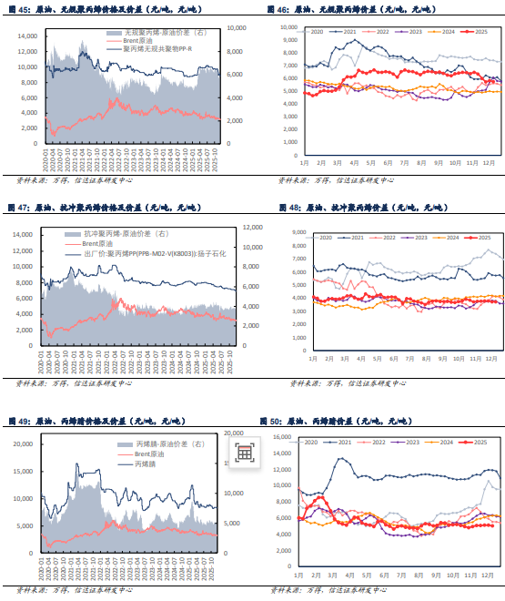 聚丙烯:本周产品价格、价差弱势下跌。本周均聚聚丙烯、无规聚丙烯、抗冲聚丙烯均价分别为5387.47(-56.86)、8935.71(-150.00)、6942.86(-57.14)元/吨,与原油价差分别为2185.86(+0.42)、5734.10(-92.73)、3741.25(+0.13)元/吨。