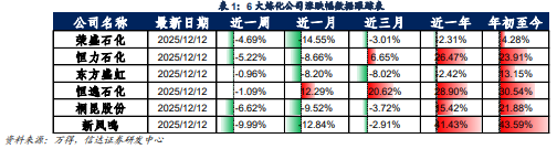 近一月涨跌幅为荣盛石化(-14.55%)、恒力石化(-8.66%)、东方盛虹(-8.20%)、恒逸石化(+12.29%)、桐昆股份(-9.52%)、新凤鸣(-12.84%)。
