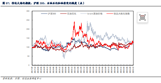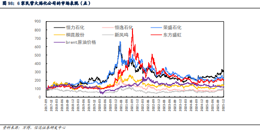 自2017年9月4日至2025年12月12日,信达大炼化指数涨幅为+45.40%,石油石化行业指数涨幅为+26.21%,沪深300指数涨幅为+19.12%,brent原油价格涨幅为+16.77%。我们以首篇大炼化行业报告《与国起航,石化供给侧结构性改革下的大道红利》的发布日(2017年9月4日)为基期,以100为基点,以恒力石化、恒逸石化、荣盛石化、桐昆股份、新凤鸣和东方盛虹6家民营炼化公司作为成份股,将其股价算数平均后作为指数编制依据。