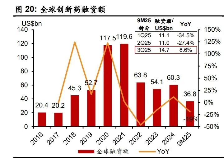 根据医药魔方的数据,2024 年全球创新药融资总额为 603 亿美元,同比增长 11%,是新冠 疫情后首次恢复正增长。2025 年,受到全球地缘环境以及美联储降息节奏的影响,前九个 月的全球创新药融资同比下降19%,但3Q25的融资额已恢复正增长(+8.6%)。我们认为 随着美联储开启降息周期,全球创新药融资将有望持续复苏,将推动全球 biotech 行业的研 发需求增长。