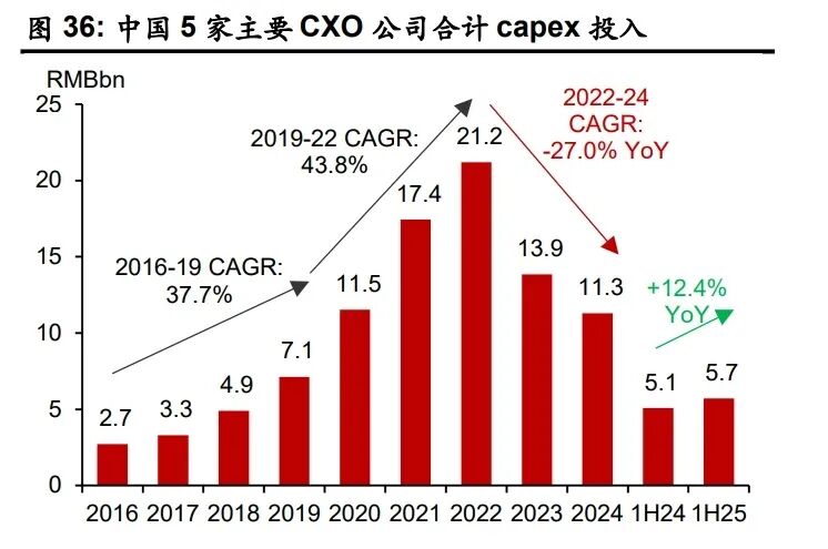 类似海外的趋势,国内大型药企、biotech和CXO在新冠期间快速提高R&D和capex支出。 新冠疫情后,中国大型药企和 biotech 的 R&D 支出仍维持增长,但 capex 支出持续下滑。 然而,CXO 公司的 capex 支出下滑的趋势在 1H25 出现反转,我们认为这与海外同行的趋 势同步,反映了全球 CDMO 需求的复苏,以及中国在全球 CDMO 行业持续抢夺份额。