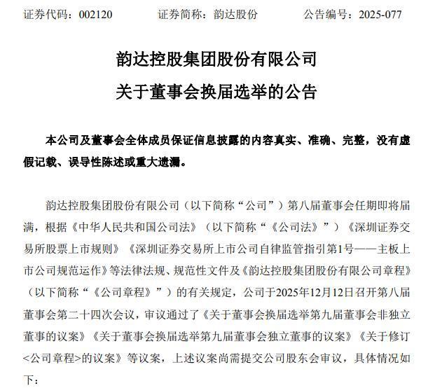 12月12日,韵达控股集团股份有限公司(简称“韵达”,002120.SZ)发布董事会换届选举公告,披露第九届董事会候选人名单。韵达实控人聂腾云夫妇之子聂毅鹏为董事候选人。