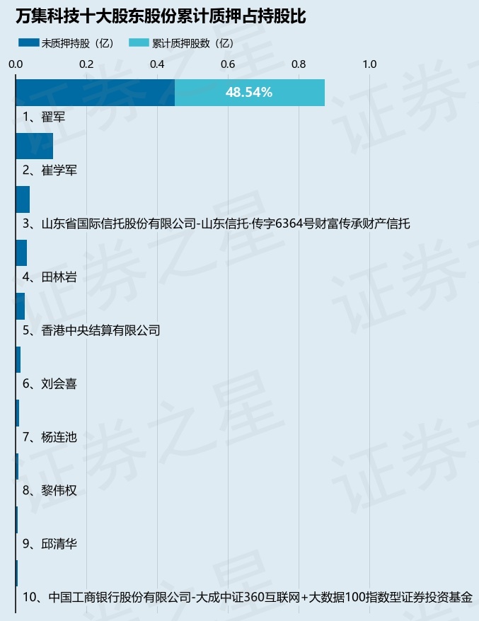 截止本公告日,股东翟军已累计质押股份4244.0万股,占其持股总数的48.54%。本次质押后万集科技十大股东的累计质押股份占持股比例(占持股比例的计算以公司最新一期财务报表公布的十大股东的持股总数为基准)见下图: