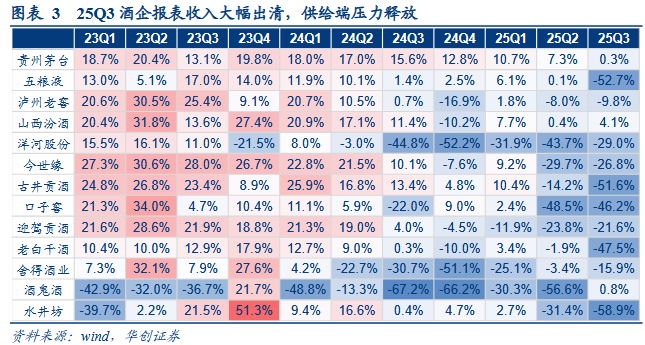 行业供需亟需再平衡,茅台批价急跌是重要信号,应理性降速、务实纾压。近期茅台批价急跌,既是行业需求压力传导至茅台的显化,也是渠道对明年担忧情绪加剧的体现。过去几年行业供需持续错配,25年中消费场景受损导致供需全面失衡,但25Q3头部酒企报表压力加速释放,“报表-动销”差额开始收敛,供需拐点已现。展望来看,预计Q4至明年H1报表增长和价格权衡难度仍较大,酒企应理性放缓,维持渠道体系稳定。