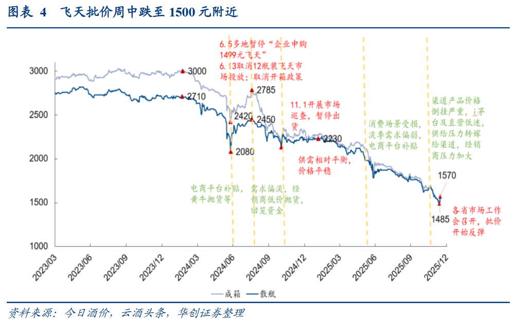 茅台批价走低寻因:供需错配下渠道悲观预期加速释放。近期茅台酒批价持续下跌引发市场担忧,原因一是消费场景虽在修复,但需求端表现相对偏弱;二是前期产品渠道价格倒挂,致使直营团购及i茅台申购低迷,供给端由直营快速转嫁至传统渠道,短期经销商供需错配加重经营压力;三是经销商普遍预期公司增长压力下,后续供给增加进而导致价格进入负向循环,普飞跌至1500元附近。
