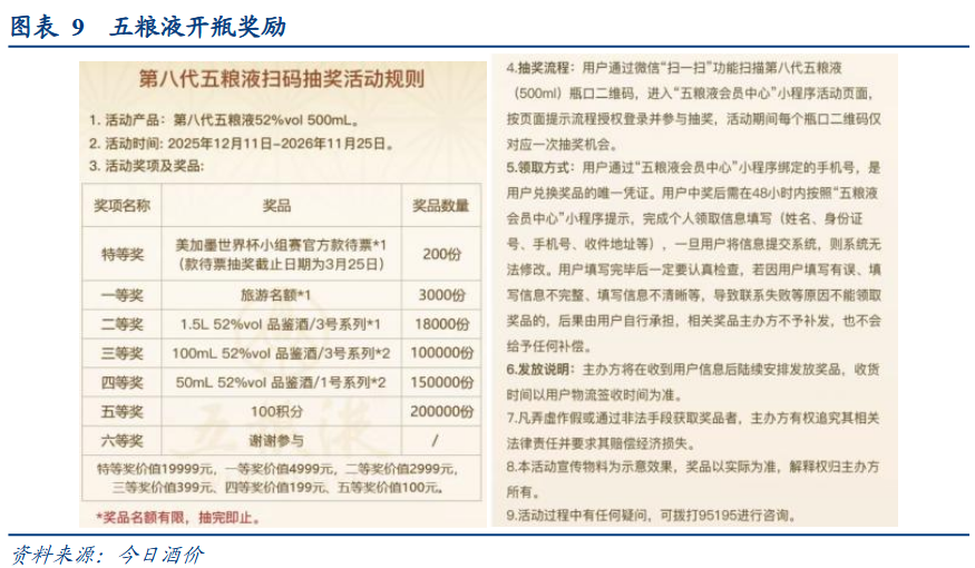 二是四项奖励保障渠道利润,若考虑1218奖励、票据支持等,奖励力度更足。公司给予渠道市场拓展/创新市场推广/模糊奖励/开瓶扫码四项奖励,激励经销商加强产品宣传推广,若每项奖励拿满、叠加后单瓶补贴可达近100元,奖励较足、有效补充渠道利润,提振渠道信心。其中普五推出扫码抽奖促销政策,活动时间持续到26年11月25日,奖品超47万份。此外公司1218奖励门槛适度降低,亦是补充渠道利润的主要方式。考虑1218返利和票据支持后,公司实际奖励力度更足。