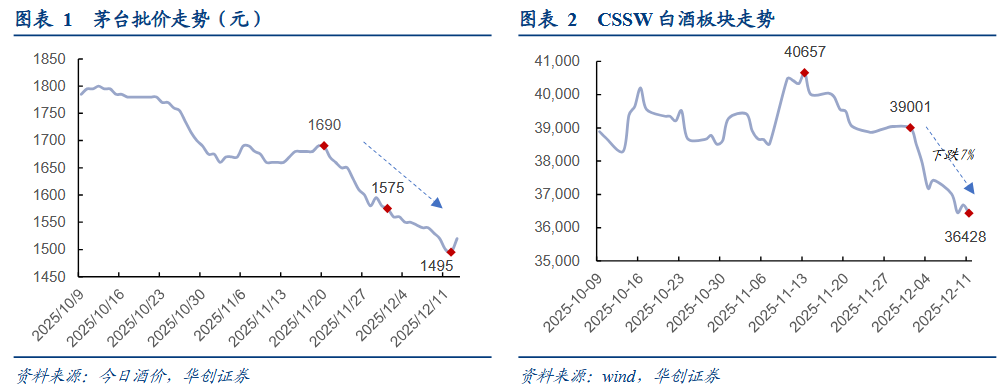 茅台:控货修复渠道信心,批价触底反弹。渠道端供需错配叠加渠道信心走弱背景下,飞天批价一度跌至1500元左右,考虑当前批价触及指导价,本周各省区密集召开市场工作会议,针对市场担忧的批价持续走低及时应对,有效纾解渠道担忧情绪,周末批价应势回升百元至1600元左右。具体内容上,一是公司拟对未完成的2025年计划外的茅台配额停止投放,不强调开门红,预计控货持续至1月中下旬。二是规划来年或将进一步缩减高附加值茅台酒产品配额,年份酒、珍品、一升装茅台等产品供给或进一步减量,并启动市场化运作,进一步抬升批价,精品茅台或强化补贴,修复经销商利润,前期“不唯指标论”定调持续落实。展望明年,我们认为公司业绩增长和稳价权衡难度仍然较大,地方支柱国企风格大概率是基于供需适配原则,报表节奏逐步下台阶,明年降速已是必然。增长路径上或通过控量高附加值产品以实现价格抬升,精品确保经销商利润空间并缓解资金压力,飞天或适度放开招商引入新鲜血液活跃经销体系,激发渠道能动性。