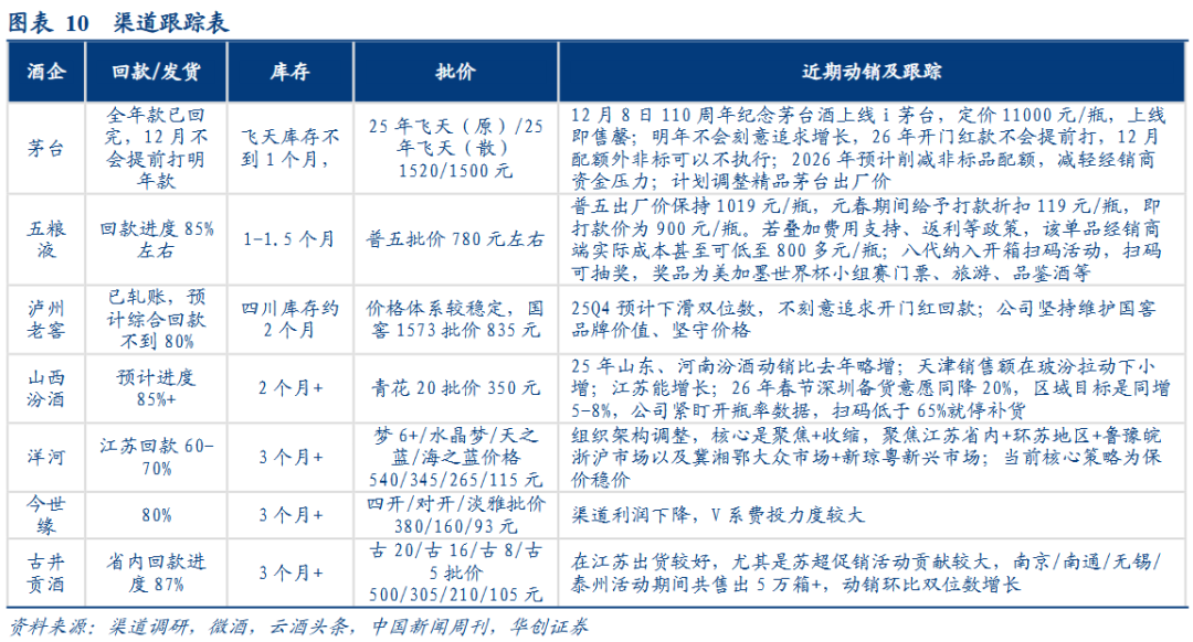 预计明年白酒行业量先于价,动销为先。于白酒行业、茅台稳价决定行业天花板高度、五粮液决定行业出清速度。当前茅五亮牌之后,26年行业运行更明确,但仍需春节回款及动销检验。其他头部亦在减少出货稳定批价,但量价矛盾、库存压力更加突出。放在两年维度,预计春节后茅五批价企稳、旺季消化库存,才是其他酒企后手出牌,降价加速去库的关键点。