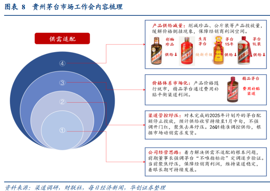 短期来看,公司不强调开门红,聚焦去库纾压。公司拟对未完成的2025年计划外的茅台配额停止投放,减少经销商库存压力。考虑春节时间节点,我们预计至1月中旬,茅台供给端将全面收窄,协助渠道去库、回补现金流,且持续强化终端价盘稳定性。后续Q1公司将根据市场动销精准调控发货节奏,不以业绩增长为目标,确保市场秩序稳定、健康。