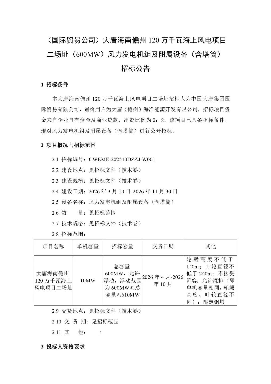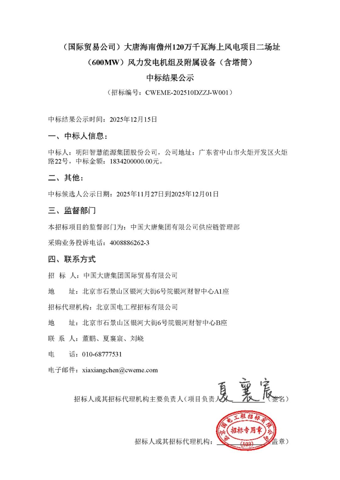 【(国际贸易公司)大唐海南儋州120万千瓦海上风电项目二场址(600MW)风力发电机组及附属设备(含塔筒)】中标结果公示