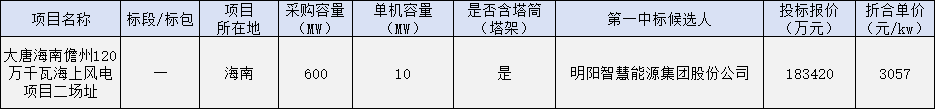 东方风力发电网讯:12月15日,大唐招标平台发布《【(国际贸易公司)大唐海南儋州120万千瓦海上风电项目二场址(600MW)风力发电机组及附属设备(含塔筒)】中标结果公示》,公告显示该项目总招标容量600MW,单机容量10MW,明阳智慧能源集团股份公司中标,投标报价183420万元。