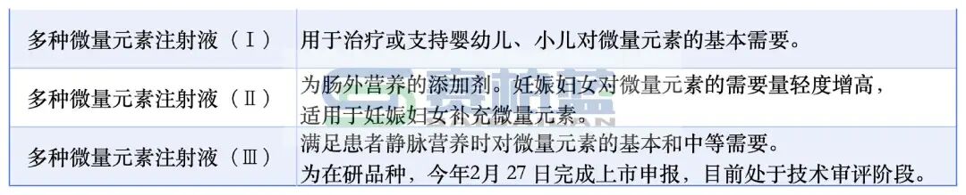 多种微量元素注射液(Ⅰ)为最早的独家儿科专用微量元素肠外营养制剂;多种微量元素注射液(Ⅱ)应用于妊娠妇女。两者均为国家医保乙类品种、省际集采产品,市场成熟度高。