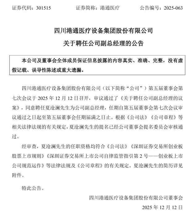 12月12日,港通医疗发布公告,聘任夏沧澜先生为公司副总经理。