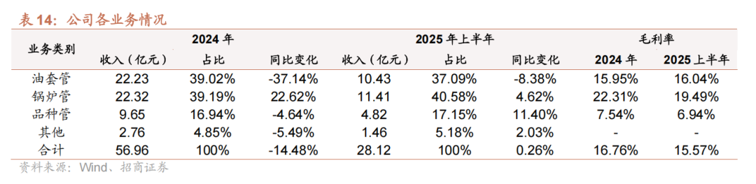 1)油套管业务:收入占比最高,但受油气需求波动和贸易壁垒影响,下降明显。2024年全年收入占比39.02%,同比下降37.14%;2025年上半年占比37.09%,同比下降8.38%。毛利率稳定微升,2025上半年16.04%,同比+0.84pcts。