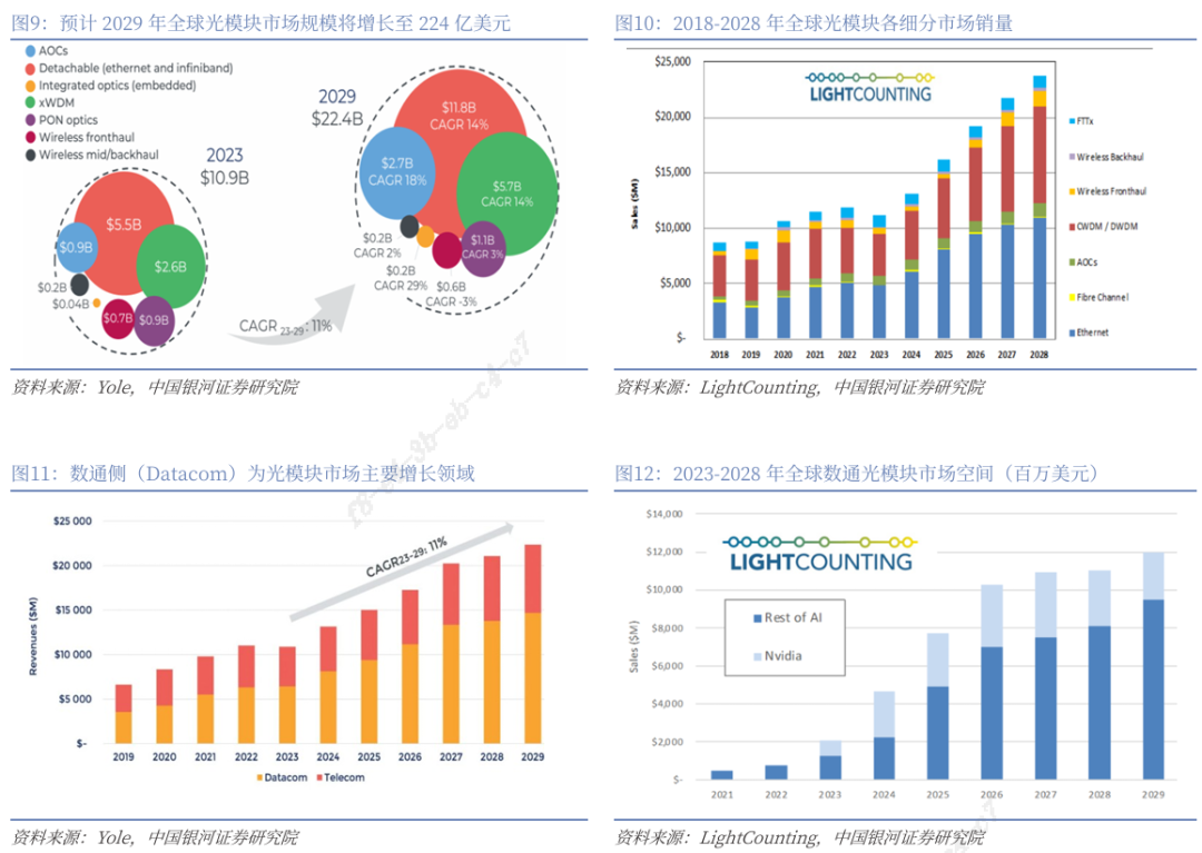 根据市场研究机构YOLE Group的最新统计数据,2023年全球光模块市场规模达109亿美元,预计到2029年将显著增长至224亿美元。这一预期增长主要得益于云计算服务商和电信运营商倾向于选择更大带宽的网络硬件,带宽越大,单位bit的传输成本越低,从而引发对高速数据模块持续的高需求。随着英伟达等公司对大型人工智能基础设施订单量的不断增加,以及数据中心网络向800Gbps的升级需求日益迫切。2023至2029年间,该市场的年复合增长率预计达到11%,其中高速光模块市场增长潜力最为强劲。根据Yole预测,全球受AI驱动的光模块市场预计在2024年将达到同比45%的增长。从细分领域来看,用于以太网&Infiniband的光模块、用于数通短距离互联场景的AOC有源光模块,两者在2029年市场规模将分别达到118亿美元和27亿美元,2023~2029年的年复合增速将分别达14%和18%。