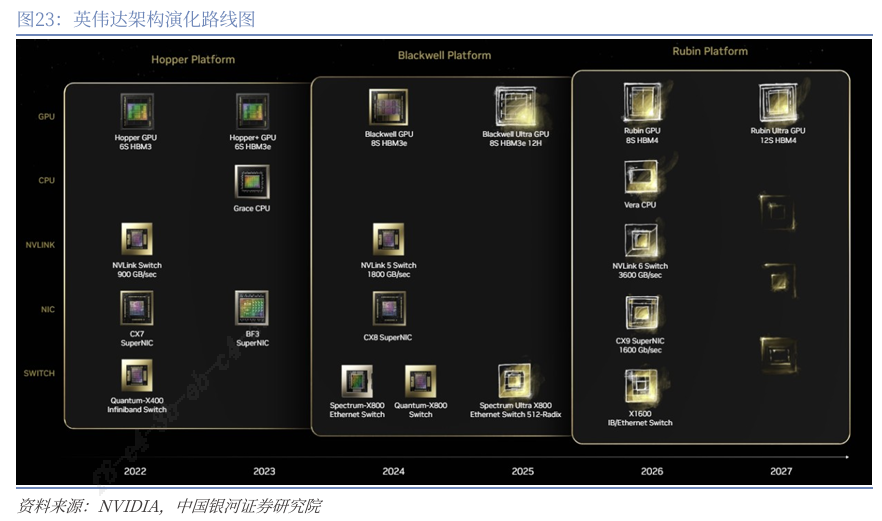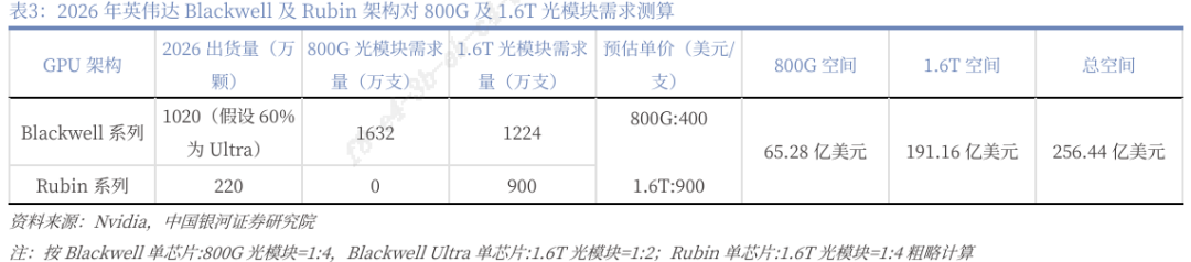 由于Rubin系列GPU将于2026年推出,参照Blackwell及Blackwell Ultra推出及量产节奏(Blackwell于2024年3月GTC大会发布,同年11月量产;Blackwell Ultra于2025年3月官宣,同年三季度开始量产),以及英伟达预测其将于明年初的GTC大会后启动样品测试,然后在2026年一季度小批量交付,2026年全年份额有望达到20%-30%,我们假设Rubin系列GPU于2026年3月GTC大会上发布,并于2026年三季度末开始大批量交付,假设上述1400万颗GPU中,大部分将以Blackwell系列为主,同时参考Hooper架构GPU累计出货量400万颗,远远低于Blackwell系列GPU出货量,我们预测2026年Rubin架构的GPU出货量有望达220万颗,2025年11月至2026年末Blackwell系列GPU出货量或将达1180万颗,典型2026年光模块市场出货量大幅提升基础。