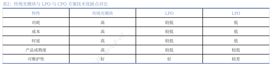 LPO和CPO技术在功耗及成本上也各具明显优势,或成未来发展方向之一。LPO(线性驱动)技术通过移除DSP降低了光模块的成本和功耗,以400G光模块为例,其7nm DSP的功耗约4W,占模块总功耗的一半,而BOM成本则占20-40%,无DSP的LPO在功耗和成本上更具优势。然而,由于DSP的功能不能完全由TIA和驱动芯片替代,LPO可能会增加误码率,进而缩短传输距离。因此LPO更适合短距离应用,如数据中心内部服务器与交换机的连接,以及机柜间的连接。而在CPO(光电共封装)技术中,光学组件被直接封装在交换机芯片旁边,进一步缩短了光信号输入和运算单元之间的电学互连长度,在减少信号损耗问题的同时实现了更低的功耗,还有助于缩小设备体积,使得数据中心的布局更加紧凑。LightCounting统计,CPO出货预计将从800G和1.6T端口开始,并于2024至2025年开始商用,2026至2027年开始规模上量,CPO端口在2027年800G和1.6T出货总数中占比预计达约30%。
