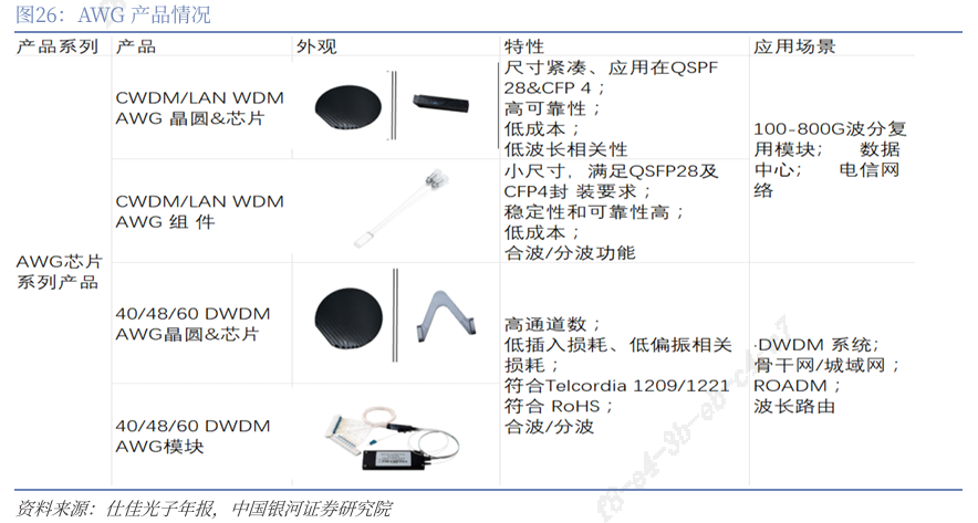 从AWG产品来看,仕佳光子AWG产品实现显著增长,从2024年报披露的业务结构来看,光芯片及器件业务收入达6.06亿元,同比增长68.14%。从应用场景拆分,AWG产品主要服务于两大市场:在数通领域,400G/800G光模块配套的CWDM/LANWDM AWG组件已实现规模化出货,特别是在海外数据中心客户中取得突破;在电信领域,DWDM AWG模块在骨干网升级中持续增长,其中60通道100GHz AWG、40通道150GHz AWG和17通道300GHz AWG芯片及模块已实现批量出货。