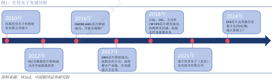 河南仕佳光子科技股份有限公司成立于2010年,主营业务覆盖光芯片及器件、室内光缆、线缆高分子材料三大板块。2012年,公司PLC分路器芯片研制成功并开始批量供货;2016年DWDM AWG芯片研制成功,开展市场推广;2017年,AWG芯片研制成功,同年收购杰科公司,整合线缆材料业务,进一步完善产业链,并在美国设立子公司;2018年,多种芯片研发成功并收购和光同诚,拓展光纤连接器业务;2024年,公司DFB芯片出货量历史累计达到1亿颗,同年成立泰国工厂。公司秉承“以芯为本”的理念,保持对光芯片及器件的持续研发投入,不断强化技术创新、掌握自主芯片的核心技术。