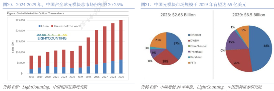 从全球光模块TOP 10厂商榜单排名的变化趋势来看,日本和美国的光模块厂商逐渐退出全球市场,中国厂商的排名稳步上升。2024年共有7家中国厂商入围,根据排名先后分别为中际旭创、新易盛、华为、光迅科技、海信宽带、华工科技、索尔思光电。随着全球领先云厂商加大对人工智能集群的投资,亚马逊、谷歌和Meta等公司对网络设备和光连接的需求推动了光模块市场的增长。英伟达在2023年成为新的增量需求主力,其供应商中际旭创、天孚通信、Fabrinet和Coherent的收入相应增长。近年来我国政策层面对算力产业链不断加码,随着国产芯片能力、大模型能力的提升、人工智能应用的发展,国内算力基础设施建设蓄势待发。光模块作为算力环节里国产化程度高、技术储备前沿的核心产品,在算力持续升级及需求大幅增长等因素的驱动下,将迎来快速增长。据LightCounting预计,2024年我国光模块的市场规模约为26.5亿美元,预计2029年有望达到约65亿美元。