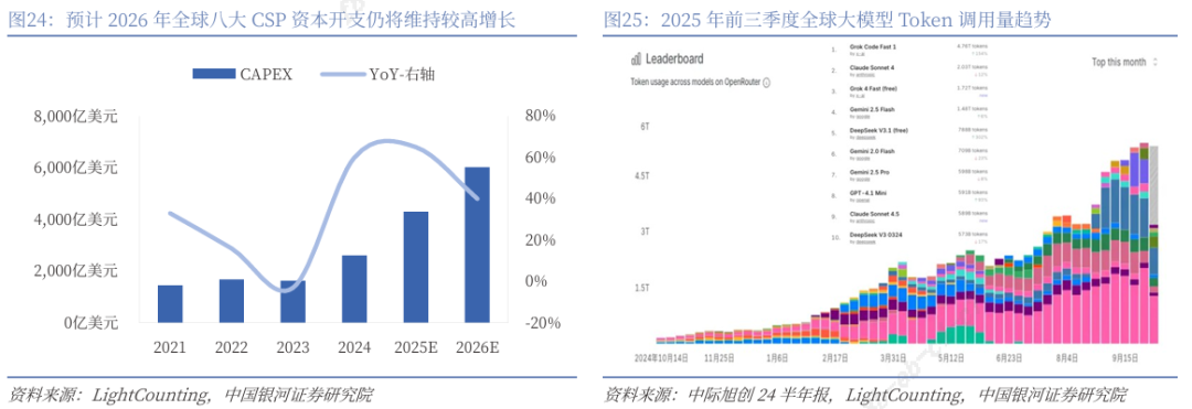 需求端:全球云厂商资本开支节奏或仍将持续高增。根据TrendForce对于谷歌、亚马逊、Meta、微软、甲骨文、腾讯、阿里巴巴、百度八家企业的资本开支预测,2025年该八家厂商资本开支将同比提升65%,而2026年将提升40%至6020亿美元,这波资本支出成长将刺激AI服务器需求全面升温,并带动GPU/ASIC、内存、封装材料等上游供应链,以及液冷散热模块、电源供应及ODM组装等下游系统同步扩张,驱动AI硬件生态链迈入新一轮结构性成长周期。我们认为当下海外云厂商如META等已有提升资本开支下限举措,预计全年资本开支有望达到此前预期上限,同时2026年资本开支需求主要来自于大模型Token数量的快速提升,以及大模型可用性的进一步增长。