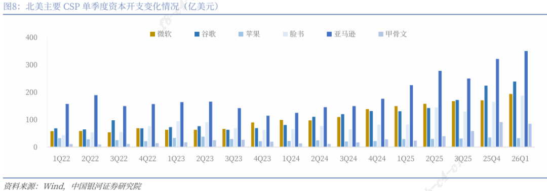 海外人工智能巨头资本开支超预期,AI基建需求持续强劲。从产业链上市公司的财务业绩表明,人工智能热潮仍在持续。2025年,Alphabet、亚马逊、苹果、Meta和微软的资本开支仍明显高于2024年,阿里巴巴宣布未来三年将投入3,800亿元用于云和AI基础设施建设,创下国内民营企业同类投资纪录。且预计海外AI巨头的资本开支将持续维持高增长,其中大部分投资将用于基础设施建设(服务器、数据中心和网络设备),尤其在生成式人工智能领域的投入,核心驱动因素在于对AI基建对业务拉动及应用端商业化前瞻预期。