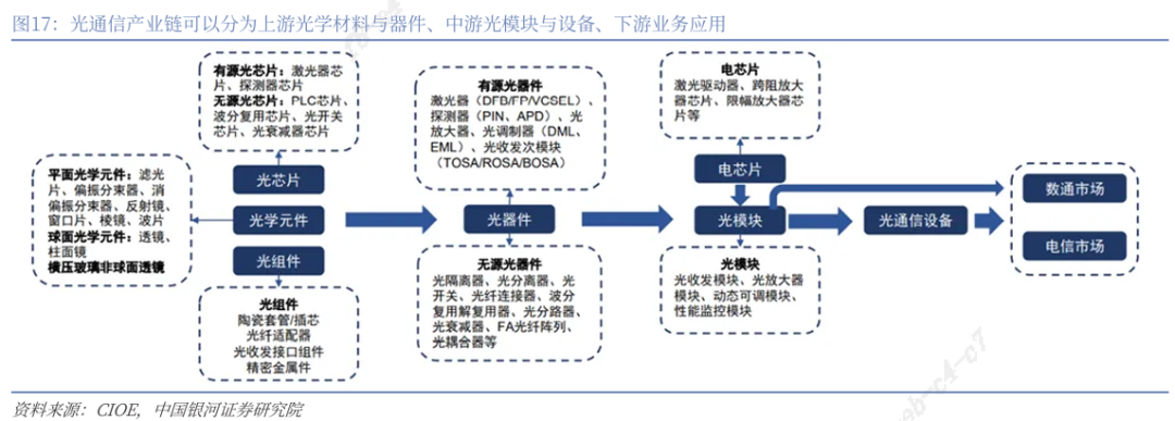 光模块是光通信设备中重要的组成硬件,其功能是进行光电和电光的转换。光模块由发送单元、传输单元和接收单元三部分组成。发送单元输入一定功率的电信号,经过内部驱动芯片处理后由驱动激光器或者发光二极管发射出相应功率的调制光信号,并通过光纤进行传输,接收端再把光信号由光探测二极管转换成电信号,并经过前置放大器后输出相应功率的电信号。光模块行业的上游主要由光芯片、光器件、电芯片构成,其中光器件行业的供应商较多,但高端光器件目前仍主要由国外供应商提供。光模块行业下游主要包括电数通市场和电信市场,其中数通市场是增速最快的市场,已超越电信市场成为光模块产业的主要增长点。