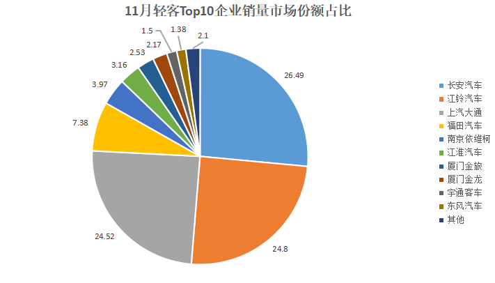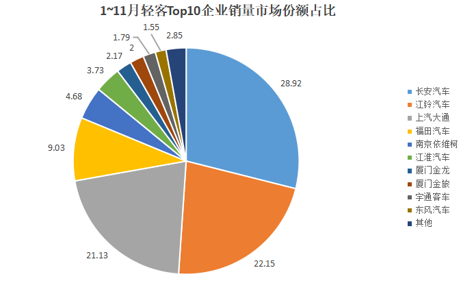再来看累计销量排名情况,与1~10月相比,1~11月轻客市场Top10企业及其排名并未发生变化,11月销量未对累计销量排名造成影响,市场格局十分稳定。